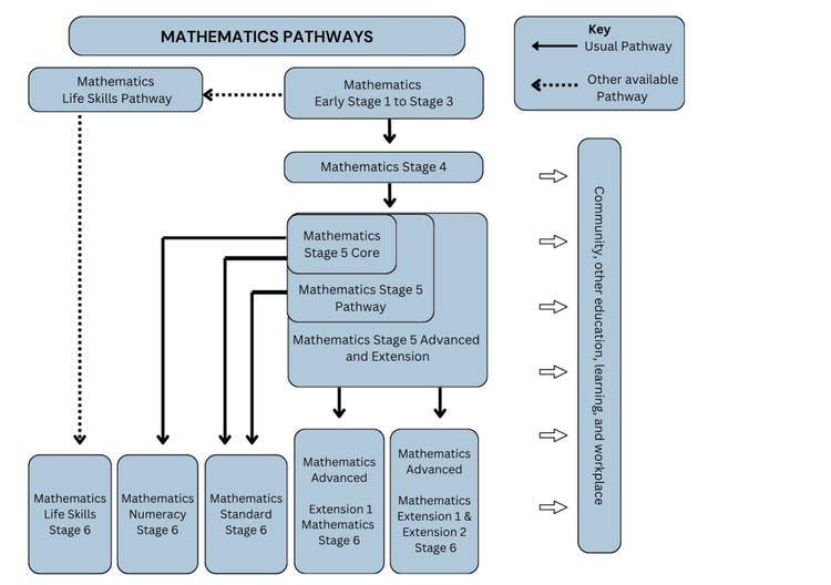 The following diagram represents available pathways of learning in Mathematics from Early Stage 1 to Stage 6. In this diagram, the Stages refer to the level of knowledge of Mathematics learning rather than to the stages of schooling. In this way it is acknowledged that a student who is in Year 7, for example, may still be working towards Stage 3 outcomes, just as a student in Year 8, for example, may be working towards Stage 5 outcomes.